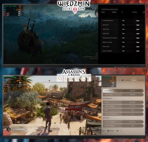 - Assassin's Creed Mirage: Rozdzielczość Full HD, ogólne ustawienia grafiki na poziomie ultra, średnia ilość FPS na poziomie 72.