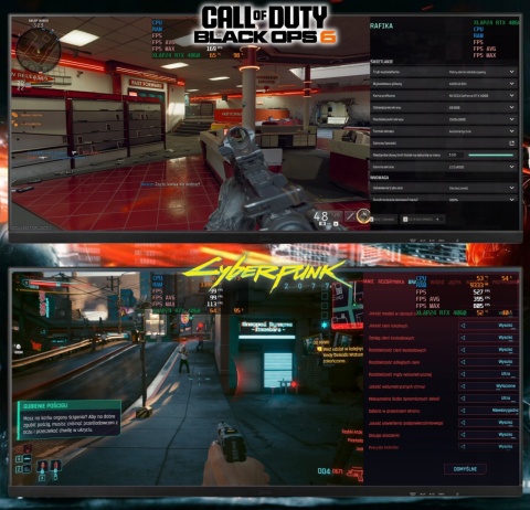 - Cyberpunk 2077: Rozdzielczość Full HD, ogólne ustawienia grafiki na poziomie wysokim/ultra, średnia ilość FPS na poziomie 100.