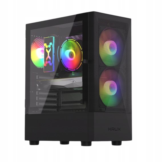 Krux Vako to obudowa typu Midi Tower, zaprojektowana z myślą o efektywnym chłodzeniu i atrakcyjnym wyglądzie. Front z panelem mesh oraz trzy fabryczne wentylatory 120 mm ARGB gwarantują dobry przepływ powietrza i przyciągający wzrok design.