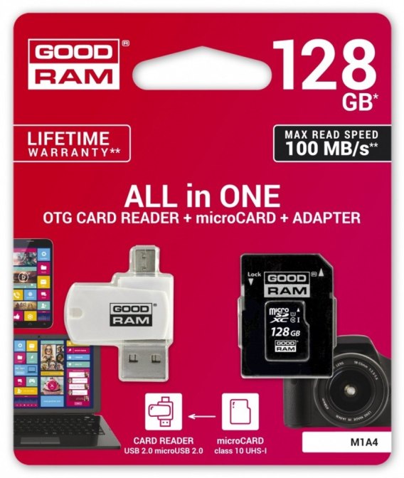 • GOODRAM Karta microSDHC 128GB CL10 szybka z adapterem i czytnikiem