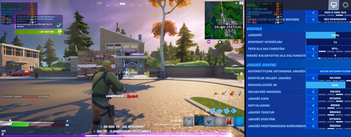 - Fortnite: Rozdzielczość Full HD, ogólne ustawienia grafiki na poziomie średnim, średnia ilość FPS na poziomie 81.