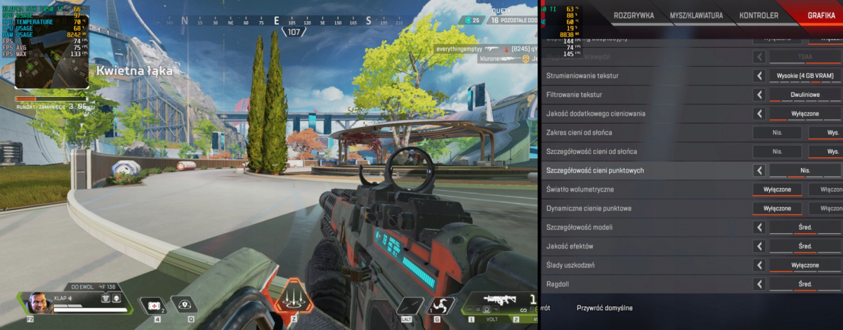 - Apex Legends: Rozdzielczość Full HD, ogólne ustawienia grafiki na poziomie średnim, średnia ilość FPS na poziomie 75.