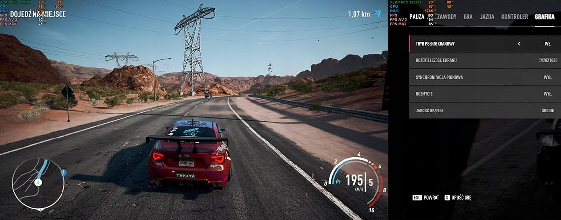 Need For Speed Payback: Rozdzielczość Full HD, ogólne ustawienia grafiki na poziomie średnim, średnia ilość FPS na poziomie 53.