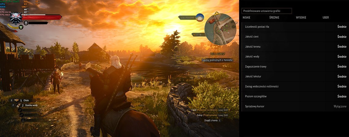 Wiedźmin 3: Rozdzielczość Full HD, ogólne ustawienia grafiki na poziomie średnim, średnia ilość FPS na poziomie 42.