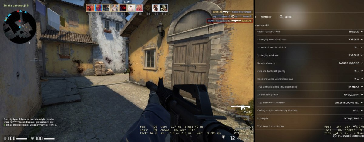 Counter Strike: Global Offensive: Rozdzielczość Full HD, ogólne ustawienia grafiki na poziomie wysokim, średnia ilość FPS na poziomie 100.