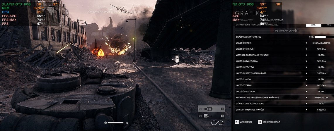 Battlefield 5: Rozdzielczość Full HD, ogólne ustawienia grafiki na poziomie wysokim/ultra ilość FPS na poziomie 65.