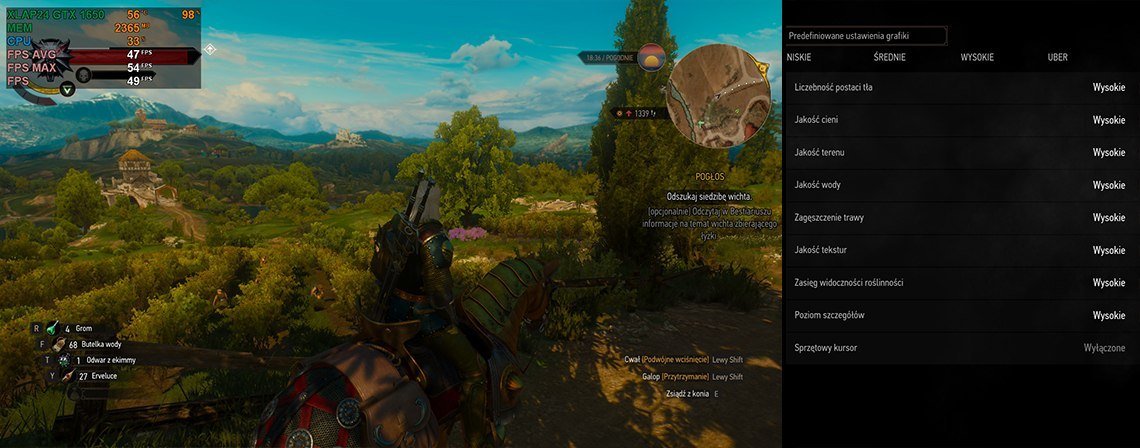 Wiedźmin 3: Rozdzielczość Full HD, ogólne ustawienia grafiki na poziomie wysokim, średnia ilość FPS na poziomie 47.
