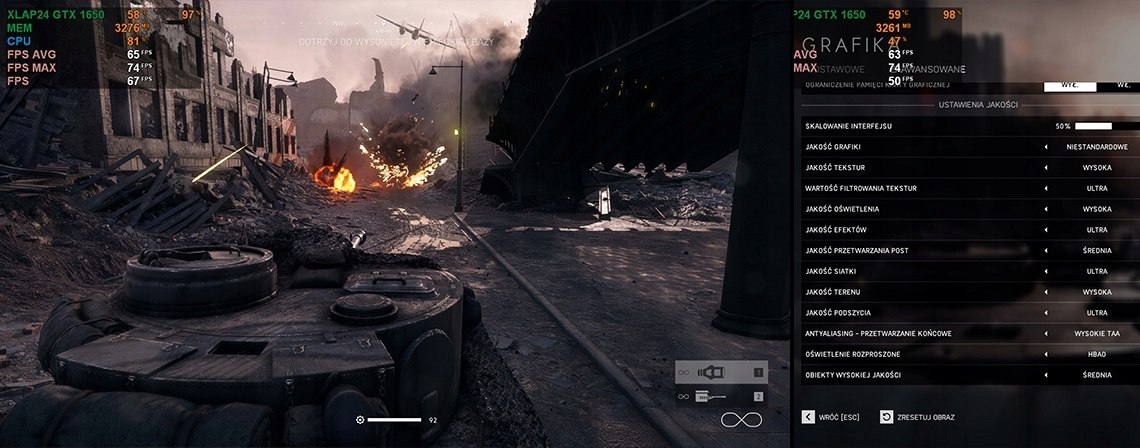 Battlefield 5: Rozdzielczość Full HD, ogólne ustawienia grafiki na poziomie wysokim/ultra ilość FPS na poziomie 65.