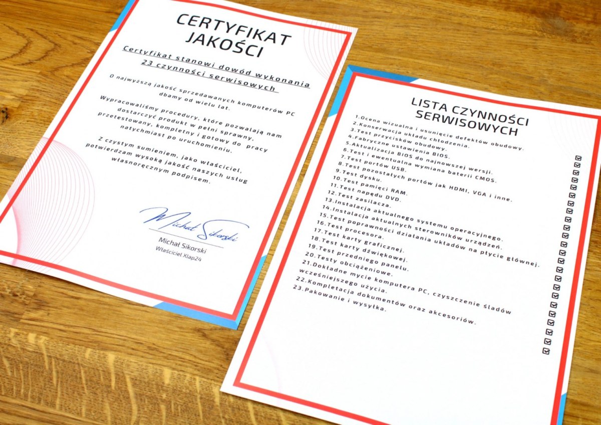 Każdy z komputerów PC sprzedawanych przez naszą firmę otrzymuje certyfikat, w którym potwierdzamy wykonanie 23 czynności serwisowych zanim sprzęt znajdzie się u naszego klienta. Certyfikat zostanie dołączony do Twojego zamówienia.